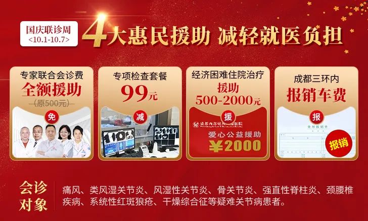 为解决四川地区广大风湿骨病患者药效差、易复发、致残率高、经济负担重等问题,在国际痛风/风湿MDT多学科会诊中心等多部门的大力支持下,特邀北京大学人民医院、中国人民解放军总医院、中国人民解放军火箭军总医院、四川大学华西医院、四川省人民医院、四川省中医院等三甲风湿骨病教授、医学博士名医团亲临成都,于国庆期间开展联合“治痛抗复发”公益会诊,并同步开展诊疗援助。